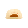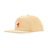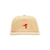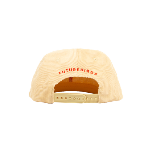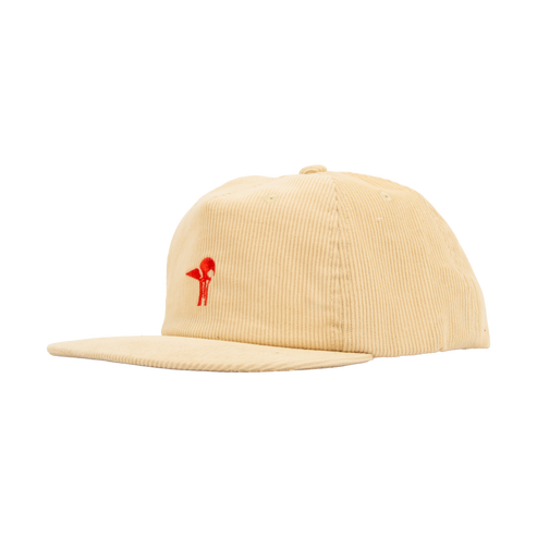 Corduroy hat with red birdhead logo embroidered on the front and band name on the back.